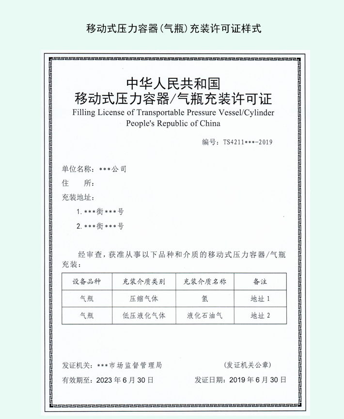 移动式压力容器(气瓶)充装许可证证书样式